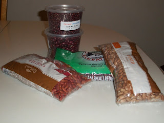 Today I decided that I wanted to try something new, something that I think can only help us as a family. We (I) are going to learn how to cook with dried beans. It doesn't probably seem like a Earth shattering decision but as stupid as it may seem I have never cooked beans that didn't start in a can (except green beans). Molly has been home sick the last two days and we have been watching Doomsday Preppers from NatGeo. It has become an addiction. The first thing we realized is that while we talk about prepping we aren't really doing anything and that has to stop. So today while grocery shopping we made sure to get extra gallons of water, a small first aid kit and shelf stable dried beans. If you have any tips or great recipes I would love to hear them :) On the table is pinto, light red kidney, small red beans, and adzuki beans. The ones in the clear containers are from a local source that will also be used for planting this weekend.